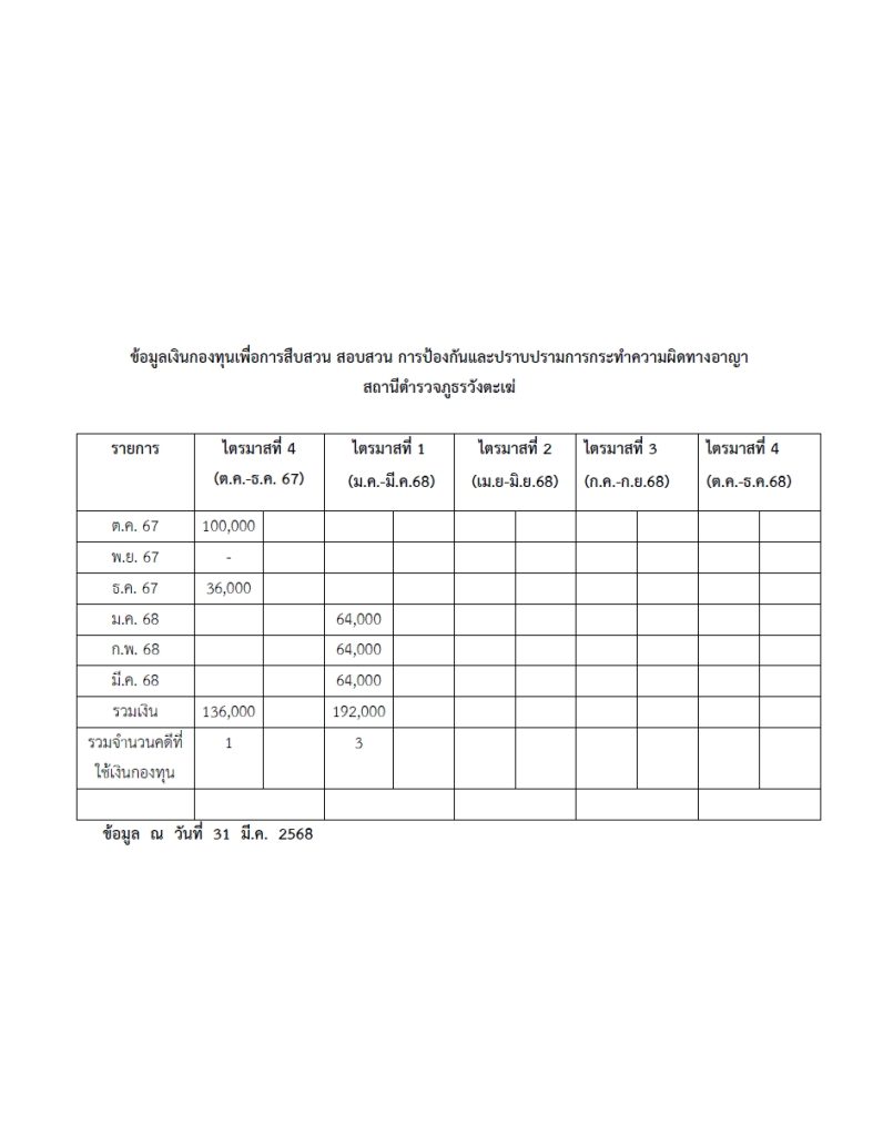 สถานีตำรวจภูธรวังตะเฆ่ ได้แสดงข้อมูลเงินกองทุนเพื่อการสืบสวนสอบสวนการป้องกันและปราบปรามการกระทำผิดทางคดีอาญาที่สถานีตำรวจภูธรวังตะเฆ่ ได้รับการจัดสรรและการใช้จ่ายเงินกองทุนฯ (ไตรมาสที่ ๔ พ.ศ.๒๕๖๗ เเละ ไตรมาสที่ ๑ พ.ศ.๒๕๖๘ ) ดังนี้